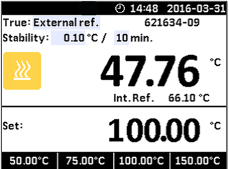 用外接标准铂电阻的CTC可以在两种模式下运行 “External ref ”(外接标准)模式代表外接标准铂电阻读数作为标准值。 “Set follows True”(外部控温) 模式下外接标准铂电阻有两个用途:测量温度作为标准值,同时控制CTC干体炉达到设定温度。